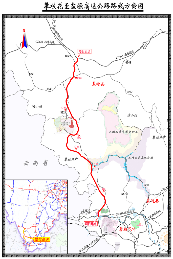 攀枝花至盐源高速公路路线方案图攀盐高速起于凉山州盐源县棉桠镇,设枢纽互通接在建的G7611西昌至香格里拉高速公路,向南经盐源县、攀枝花市盐边县、仁和区、西区、止于仁和区太平乡,接已建的G4216丽江至攀枝花高速公路。项目路线全长约131.3公里,其中攀枝花境内约86.3公里,凉山州境内约45公里,全线采用双向四车道高速公路标准建设,设计时速80公里,路基宽度25.5米,全线共设桥梁67座、隧道20座、互通式立交10处,桥隧比约80%。项目概算总投资约343.4亿元,预计建设工期6年。